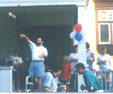 On the morning of the picnic. Bridget made deviled eggs and her famous potato salad; Russ hung the flags and checked on sporting equipment. Up went the badminton net and out came the croquet set. We then blew up dozens of balloons which were attached in bunches to the ends of badminton posts, on porch rails, and anywhere else they'd make a good show.